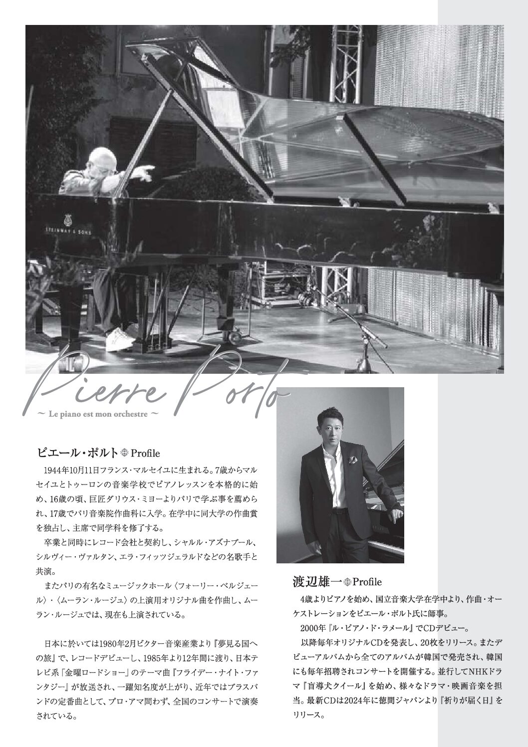 コンサートピエール・ポルト ピアノ・コンサート ~フライデーナイト・ファンタジー~公演・チケット情報 日本アーティスト > 公演・チケット情報 > ピエール・ポルト ピアノ・コンサート ~フライデーナイト・ファンタジー~ ピエール・ポルト ピアノ・コンサート ~フライデーナイト・ファンタジー~【販売前】2026年03月16日10時00分 に販売開始開催日時2026年11月27日(金) / 19:00 開演会場浜離宮朝日ホール料金S席8,000円A席7,000円U-252,500円ご予約・日本アーティストチケットセンター TEL03-5305-4545(平日10-18時) ・チケットぴあ ・ローソンチケット ・イープラス プログラム・枯葉~愛の讃歌メドレー ・フライデーナイト・ファンタジー ・ワルツ・ノクターン(渡辺 雄一) ・他 公演に関するお問い合わせお問い合わせフォーム日本アーティストチケットセンター03-5305-4545