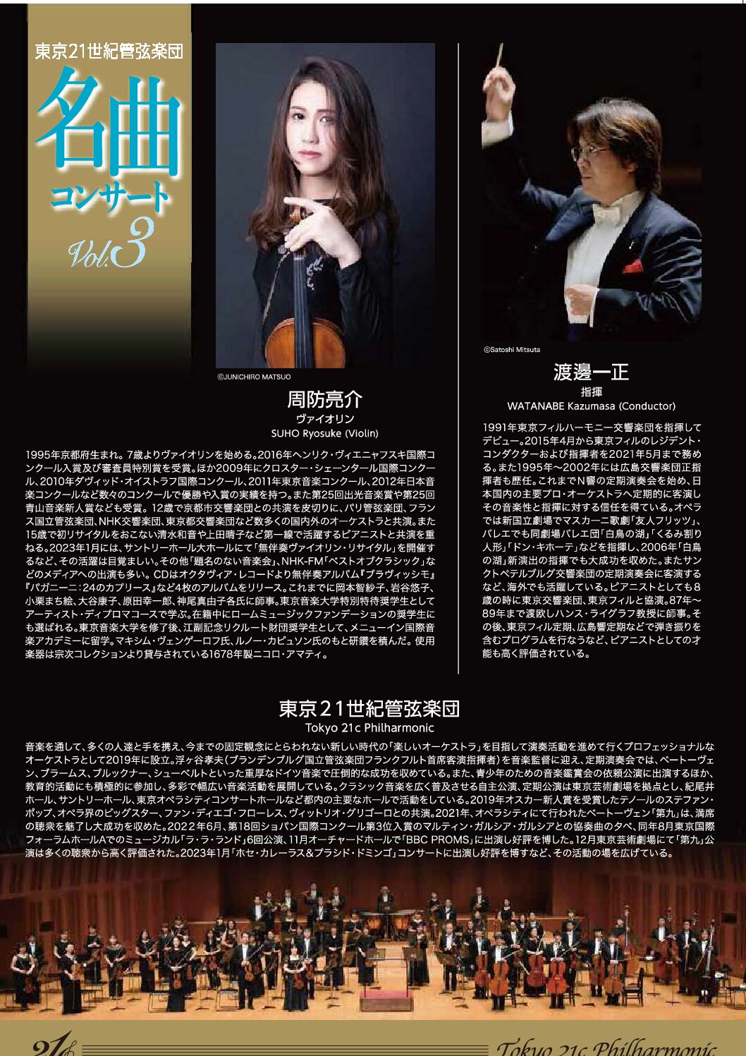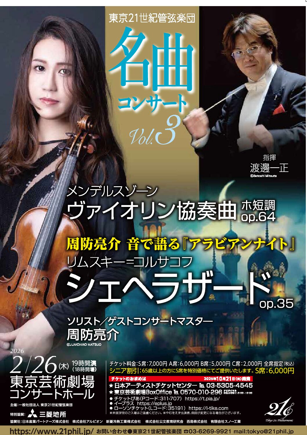 オーケストラ東京21世紀管弦楽団 名曲コンサートVol.3公演・チケット情報 日本アーティスト > 公演・チケット情報 > 東京21世紀管弦楽団 名曲コンサートVol.3 東京21世紀管弦楽団 名曲コンサートVol.3【販売中】開催日時2026年02月26日(木) / 19:00 開演会場東京芸術劇場コンサートホール料金S席7,000円枚残席数: 20枚シニア特典(65歳以上)6,000円枚残席数: 20枚A席6,000円枚残席数: 16枚B席5,000円枚残席数: 16枚C席2,000円枚残席数: 16枚ご予約・日本アーティストチケットセンター 03-5305-4545 ・東京芸術劇場BoxOffice 0570-010-296 ・チケットぴあ ・ローソンチケット ・イープラス 本公演のお問い合わせ ・東京21世紀管弦楽団 ☎03-6269-9921 ✉tokyo@21phil.jp プログラムメンデルスゾーン:ヴァイオリン協奏曲 ホ短調op.64 リムスキー・コルサコフ:シェヘラザードop.35 他 ご予約はこちらから公演に関するお問い合わせお問い合わせフォーム日本アーティストチケットセンター03-5305-4545 20260226名曲コンサートVol.3チラシダウンロード